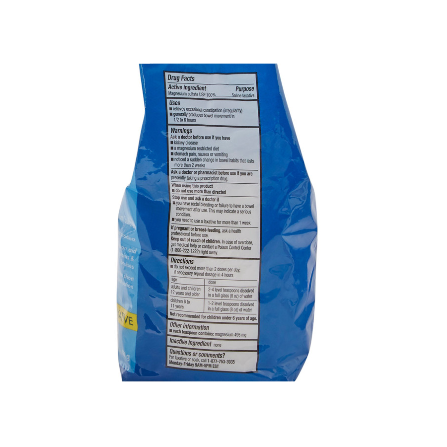 Made of pure magnesium sulfate, Epsom salt granules are safe as an oral saline laxative that draws water into the colon and produces a bowel movement in 30 minutes minimum.