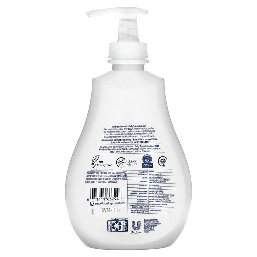 The best lotion for babies should give the gentle, nourishing care their delicate developing skin needs. Bathing can lead to skin dryness, so use fragrance free Baby Dove Sensitive Moisture Lotion afterward to help replenish the essential moisture and nutrients in your baby’s skin. Made with 100% skin-natural nutrients, Baby Dove Sensitive Moisture Lotion helps moisturize and replenish your baby’s precious skin barrier for up to 24 hours, leaving baby’s skin soft. From the very first use, this lotion for baby soothes and hydrates to help baby's skin retain its natural moisture. It is dermatologist and pediatrician tested so you can feel reassured that your baby’s skin is getting the extra special care it deserves. Plus, the gentle, hypoallergenic and pH-neutral formula of our baby body lotion is suitable to use even on your newborn. Baby Dove Sensitive Moisture Lotion is also suitable for eczema prone skin. Use Baby Dove Sensitive Moisture Lotion after bathing your baby with Baby Dove Sensitive Moisture Tip to Toe Wash.