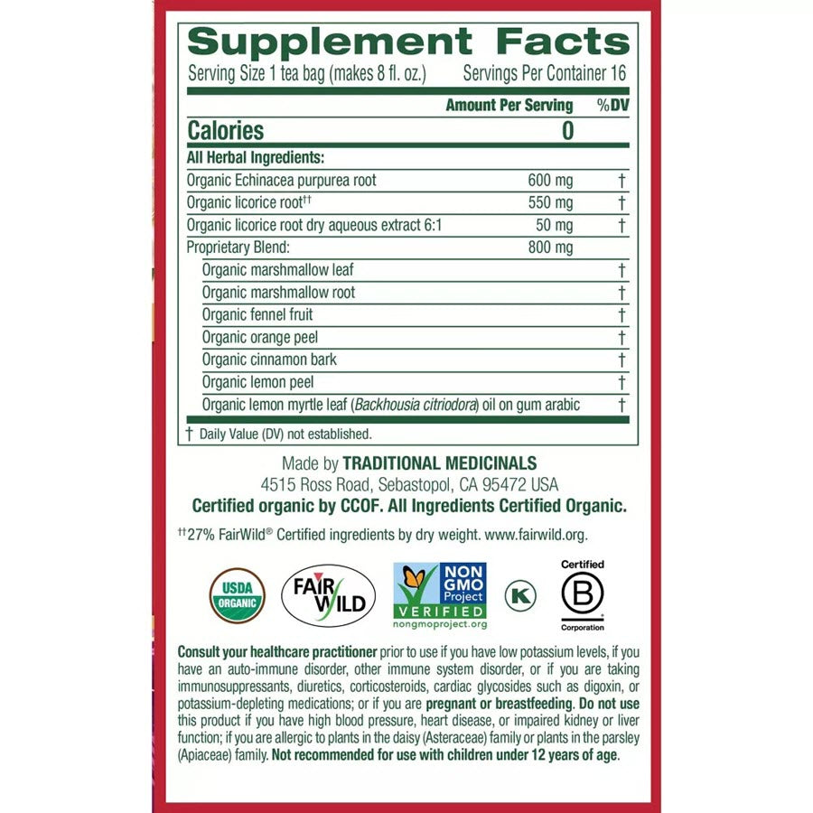 Traditional Medicinals Organic Throat Coat Lemon Echinacea Herbal Tea - 16ct
