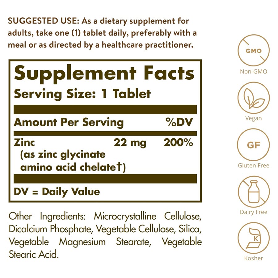 Solgar Chelated Zinc 22 mg, 100 Tablets