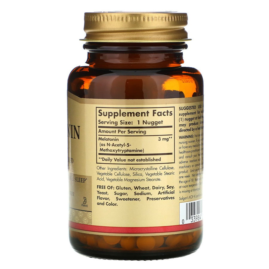 Solgar's Melatonin 3 mg Nuggets are a terrific choice for people experiencing occasional sleeplessness, those with jet lag or anyone wanting to promote sound, quality sleep. This product works with your natural sleep cycle to give you the tranquil rest you deserve, so you can awaken feeling refreshed and revitalized.