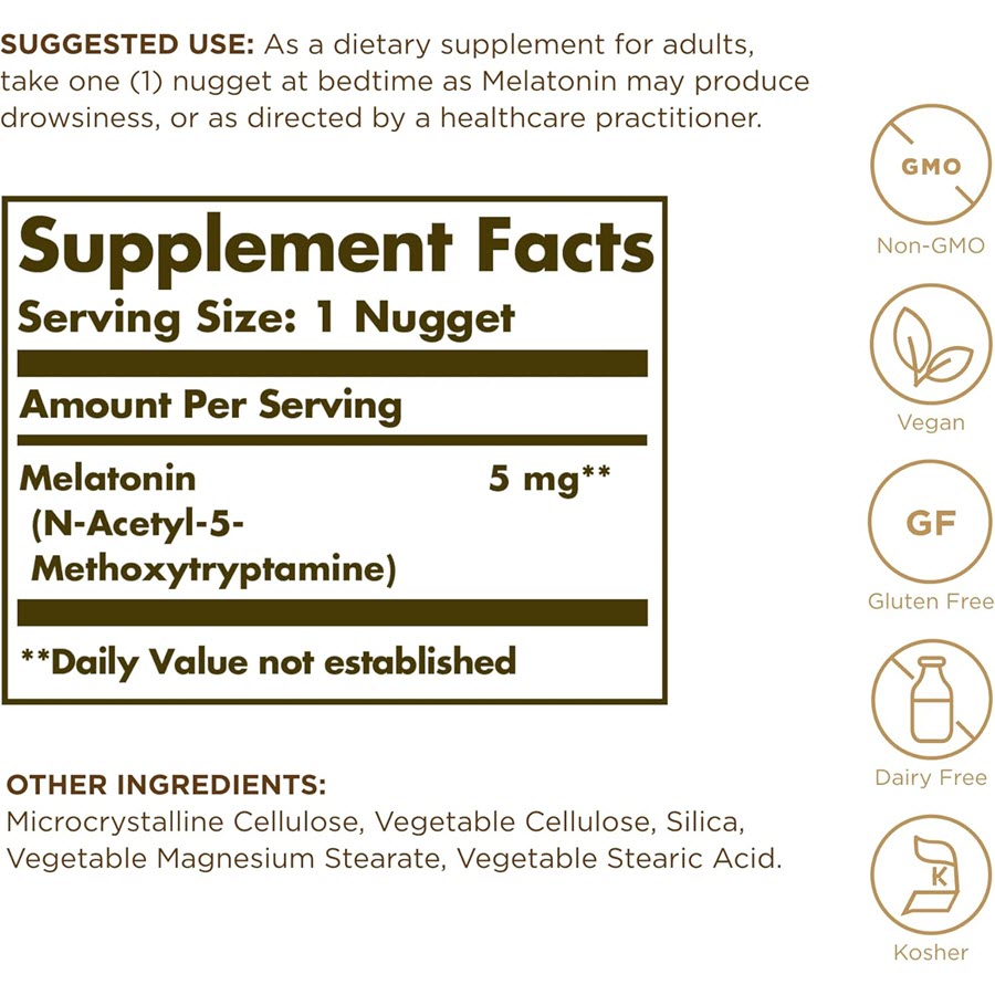 Relaxation & Rest; Solgar Melatonin 5 mg is a terrific choice for people experiencing occasional sleeplessness, those with jet lag, or anyone wanting to promote sound, quality rest.