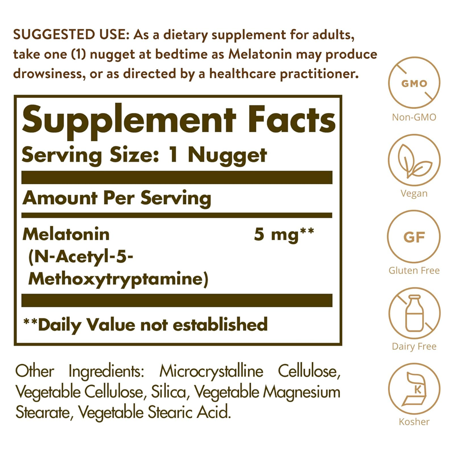 Solgar's Melatonin 5 mg Nuggets are a terrific choice for people experiencing occasional sleeplessness, those with jet lag or anyone wanting to promote sound, quality sleep. This product is also ideal for those individuals who may need a higher level of sleep support.