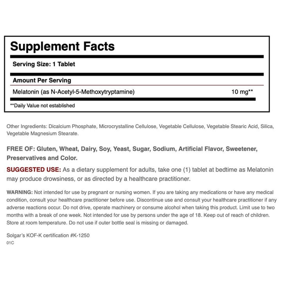 Solgar® Melatonin 10 mg Tablets are a terrific choice for people experiencing occasional sleeplessness, those with jet lag or anyone wanting to promote sound, quality sleep. This product works with your natural sleep cycle to give you the tranquil rest you deserve, so you can awaken feeling refreshed and revitalized.