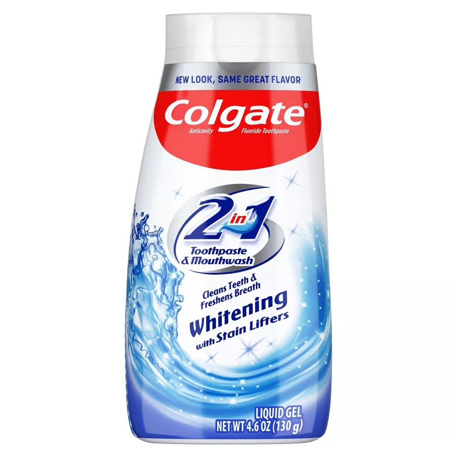 Colgate 2 in 1 Toothpaste and Whitening Mouthwash combines the power of an anti-cavity whitening toothpaste and a breath-freshening fluoride mouthwash into one toothpaste formula to maintain a bright smile and clean teeth. This minty Colgate mouthwash and teeth whitening toothpaste fights cavities, provides enamel protection, and freshens your breath with an intense burst of Mint flavor every time you brush. Plus, this 2 in 1 mint toothpaste also helps restore the natural whiteness of your teeth with stain lifters to make your smile brighter.