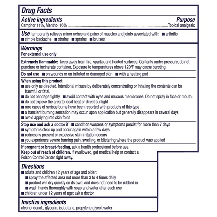 Icy to dull, hot to relax. Introducing Icy Hot Pro Dry Spray, a powerful pain-relieving spray designed to give you fast-acting, targeted relief for aching muscles and joints. The Icy Hot Pro patented formula contains two maximum-strength pain-relieving ingredients, menthol and camphor. These two pain relievers work together to penetrate to the nerves and work on more points of pain. Best of all, this dry spray is a quick-drying formula that's designed for a mess-free experience. The actuator sprays at any angle, making it easy to reach those hard-to-reach places.