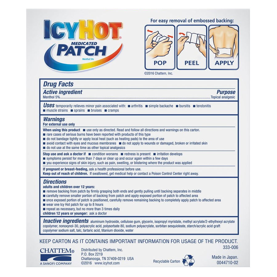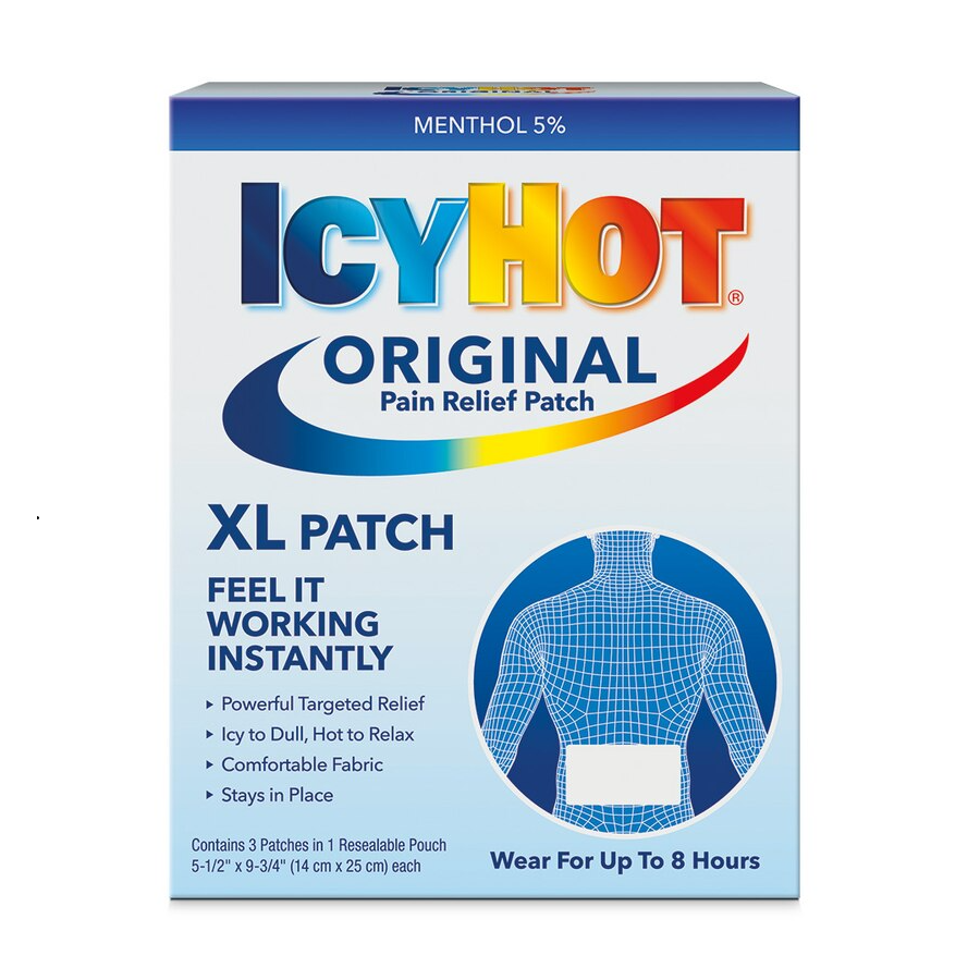 Get aches and pains under control with easy-to-use Icy Hot Original Pain Relieving Patches. These extra-large pain patches stop pain at the source and give you powerful pain relief for up to eight hours. They're icy to dull the pain, then hot to relax it away. Icy Hot Pain Patches are easy to apply and comfortably stay in place for hours. Best of all, these medicated pain patches are mess-free. Use Icy Hot XL Pain Relief Patches to help temporarily relieve minor pain associated with back pain, muscle pain, arthritis pain, sprains, bruises and muscle cramps. This box contains six large pain patches for back pain and other large areas. At the gym, at home or on the job, rely on Icy Hot Medicated Pain Relief Patches for lasting pain relief.