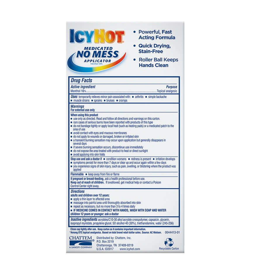 Experience powerful pain relief and a convenient mess-free application that keeps hands clean. Icy Hot Original Medicated Pain Relief Liquid provides fast-acting pain relief for minor aches and pains associated with arthritis, back pain, sore muscles, sprains, bruises and muscle cramps. It's icy to dull the pain, then hot to relax it away. Use the applicator to roll on the pain relief liquid and massage into the painful area to begin to feel relief.