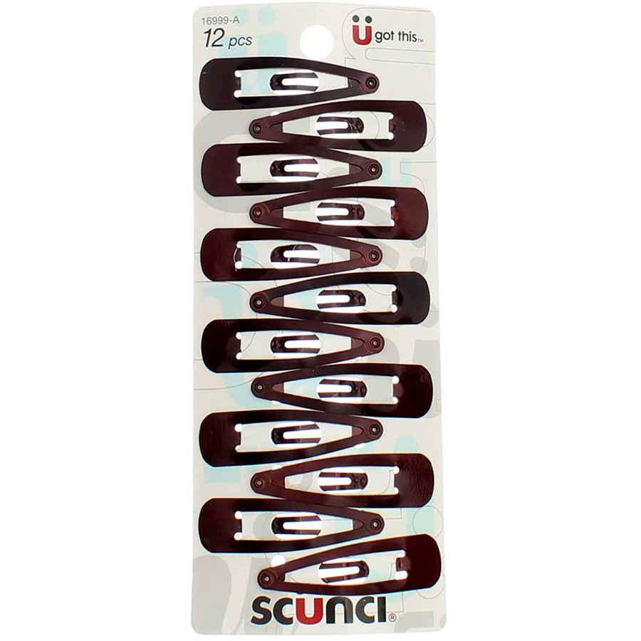 Fashion meets function with these Scunci brown metal snap clip barrettes.