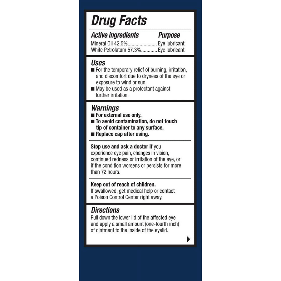 For use as a protectant against further irritation or to relieve dryness of the eye. Dosage = a small amount (one-fourth inch) of ointment to the inside of the eyelid at night.