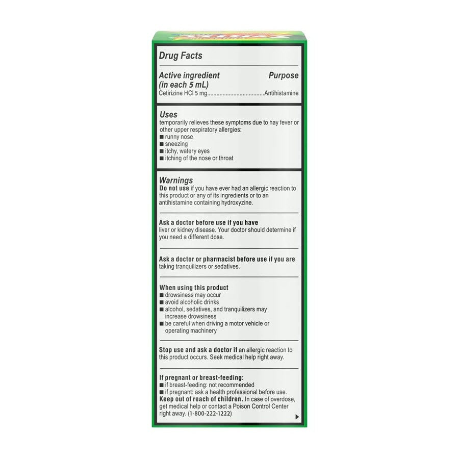 Allergy syrup gives powerful relief with 5 mg of antihistamine cetirizine hydrochloride per 5 mL