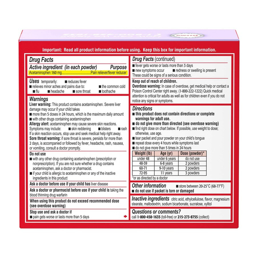 Temporarily reduce fever and relieve minor aches and pains with these kids dissolve powder packets.