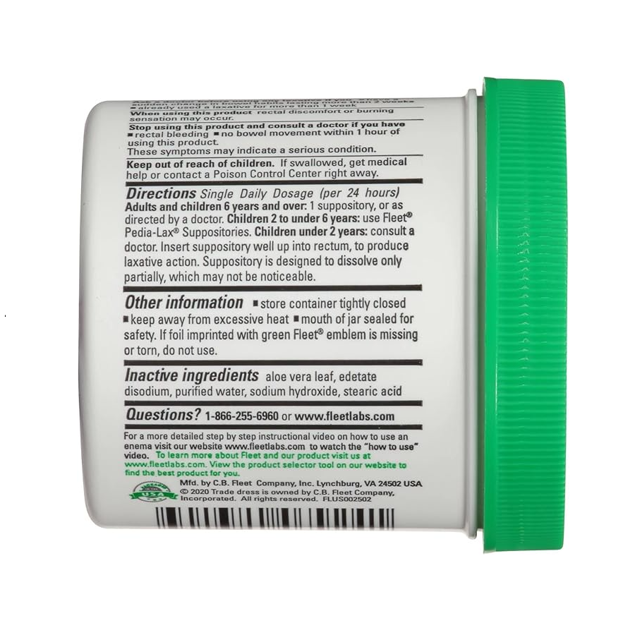Fleet glycerin laxative suppositories, adult jar relieves occasional constipation. Works in minutes for gentle, effective relief of occasional constipation. Generally produces a bowel movement in 15 minutes to 1 hour.