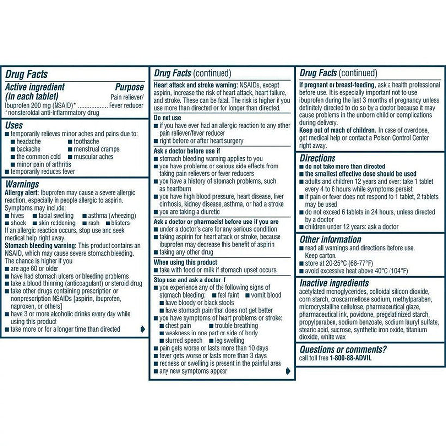 PAIN RELIEF: Advil Coated Tablets contain 200mg of Ibuprofen. Tough headache, minor arthritis, menstrual cramps, backache, and other pains don’t stand a chance against Advil