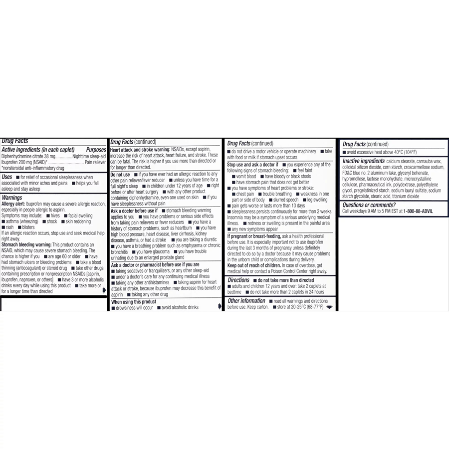 Patented, Dual Layer Caplet: Advil PM is the only brand offering an exclusive bi-layer patented formula; Each caplet combines the no. 1 Ibuprofen brand with the no. 1 soothing sleep aid (Diphenhydramine) that helps you relieve pain and fall asleep