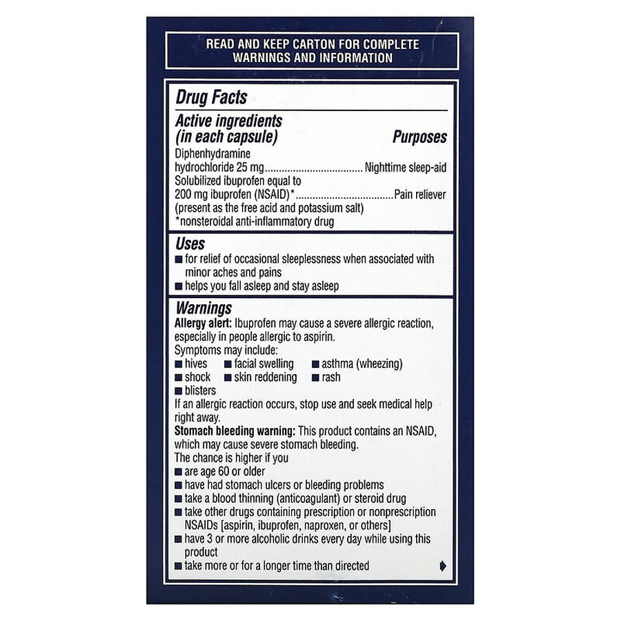 Ibuprofen PM pain medicine helps relieve occasional sleeplessness related to minor aches and pains