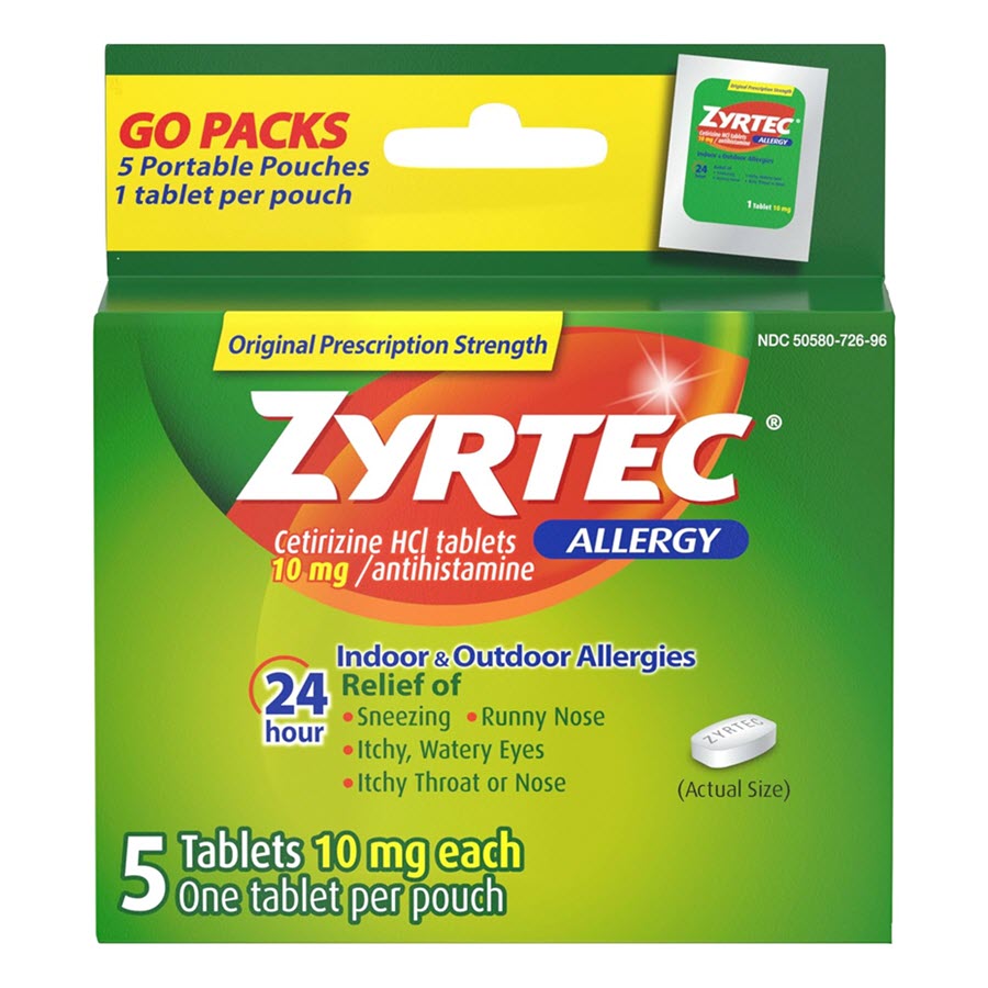 Pack of 5 individually wrapped tablets of Zyrtec 24 Hour Allergy Relief Tablets with cetirizine HCl provides powerful relief of your worst indoor & outdoor allergy symptoms, including runny nose, sneezing, itchy, watery eyes, & itchy nose & throat