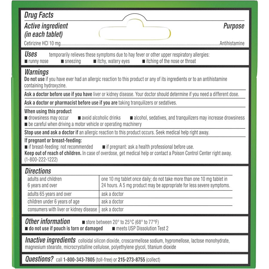 Get 24-hour relief from allergy symptoms caused by ragweed, tree pollen, dust mites, pet dander hay fever and other upper respiratory allergies with Zyrtec Allergy Relief Medicine Tablets. With 10 milligrams of the antihistamine cetirizine hydrochloride per tablet, this prescription-strength allergy relief medicine provides 24 hours of relief from common symptoms of allergies including runny nose, sneezing, itchy, watery eyes, and itching of the nose or throat. From the #1 allergist-recommended brand among OTC oral antihistamines, these all-day anti-allergy tablets effectively treat indoor allergies caused by dust, mold, and pet dander, as well as outdoor seasonal allergies from tree pollen, weeds, and grasses.