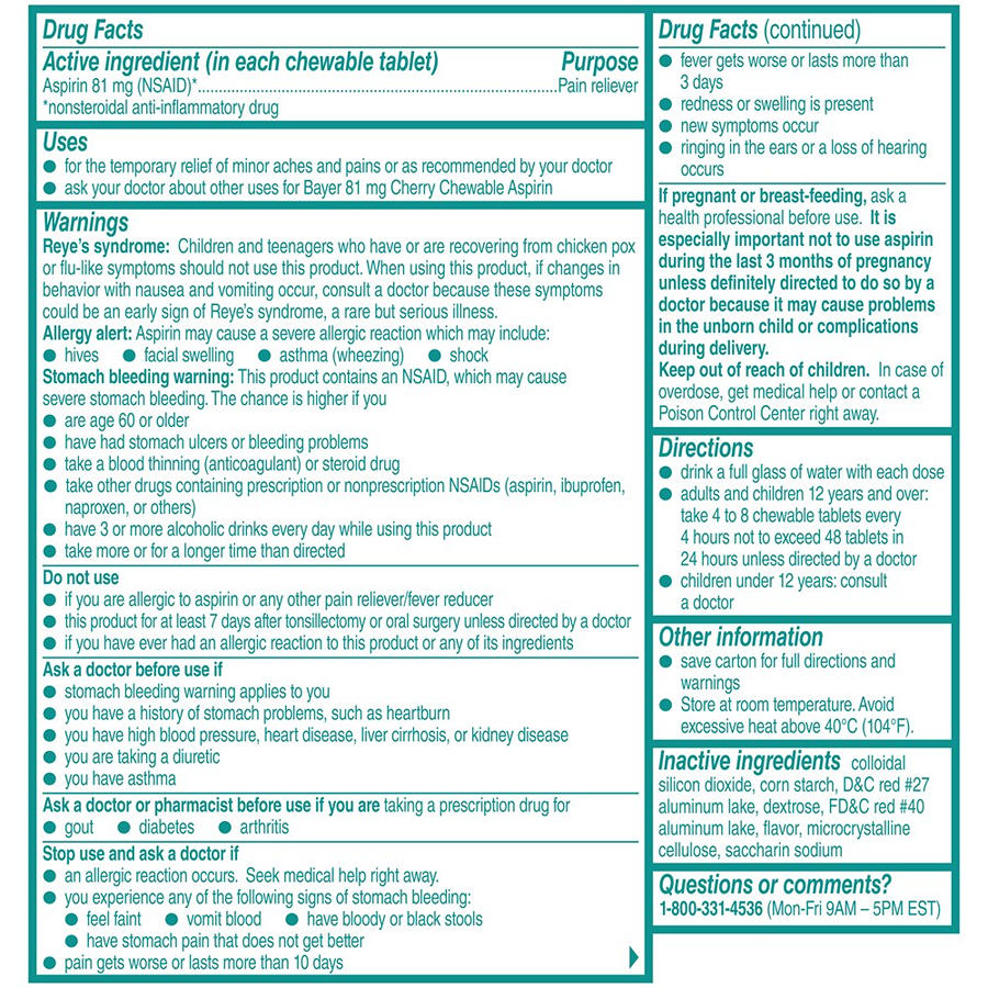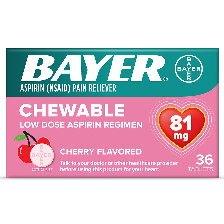 Regimen Bayer Chewable 81 mg contains one-quarter the dose of a regular strength aspirin. The tablets are chewable for individuals who have difficulty swallowing pills