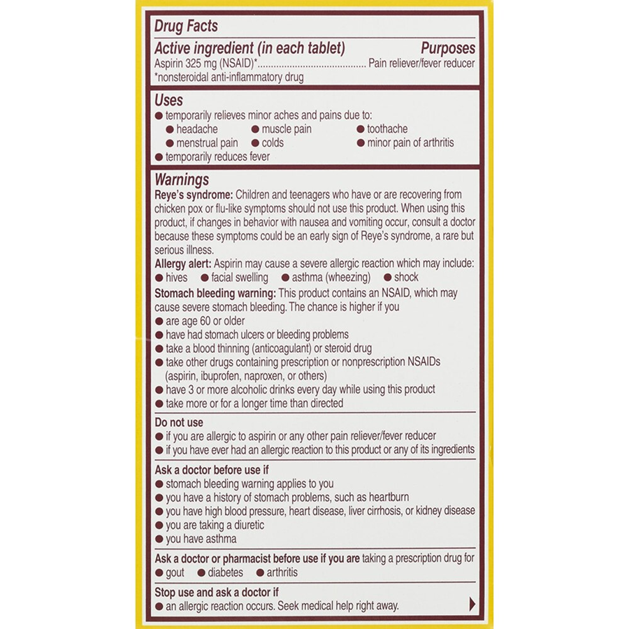 Bayer Aspirin provides pain relief from headaches, backaches, muscle pain, toothaches, menstrual pain and minor arthritis pain.