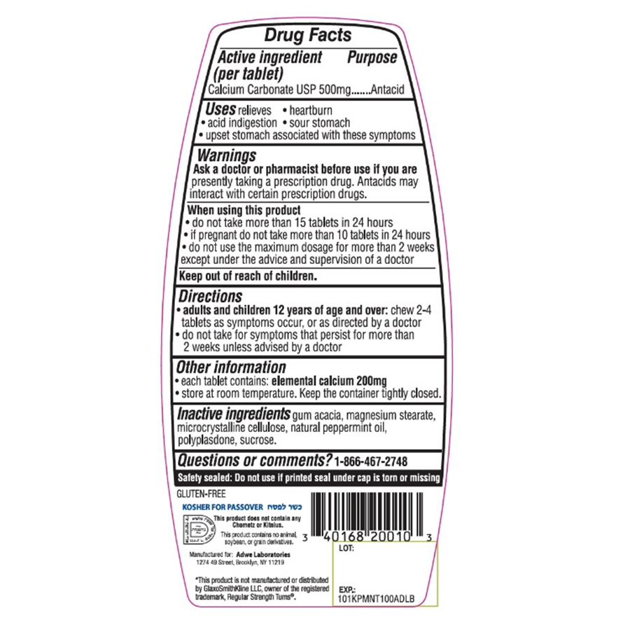 Adwe Fast Acting Calcium/Heartburn Relief, Chewable Peppermint Flavor - 100 Tablets