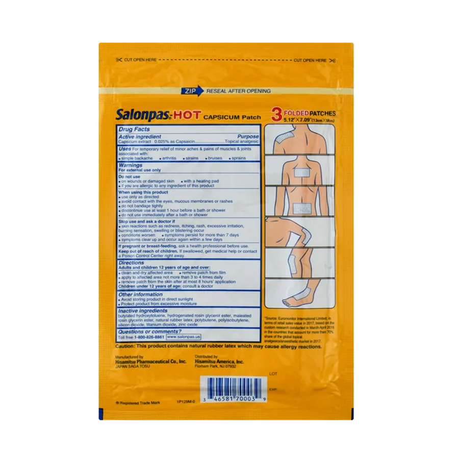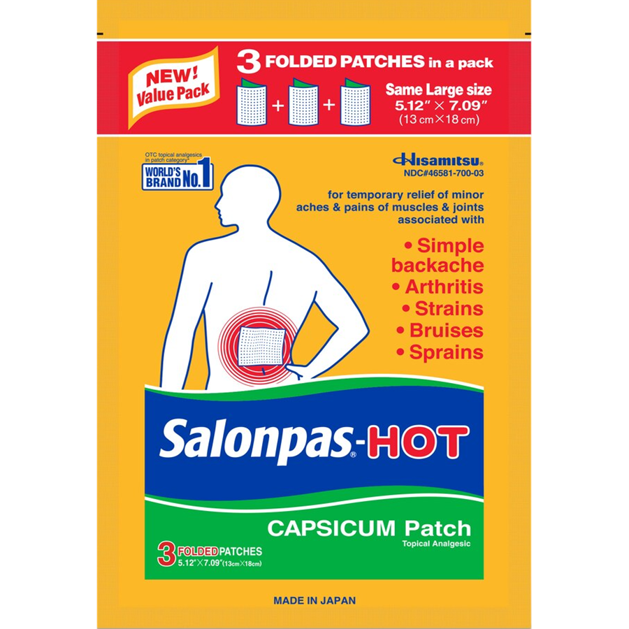 Salonpas HOT contains Capsaicin, an unscented topical analgesic. Derived from chili peppers Capsaicin provides a warming sensation that provides effective pain relief for up to 8 hours. This patch is versatile enough to provide temporary relief of minor aches and pains of muscles and joints associated with Simple Backache, Arthritis, Strains, Bruises and Sprains.