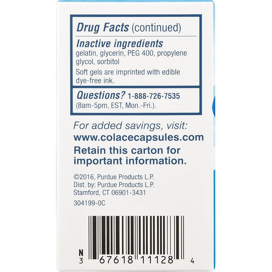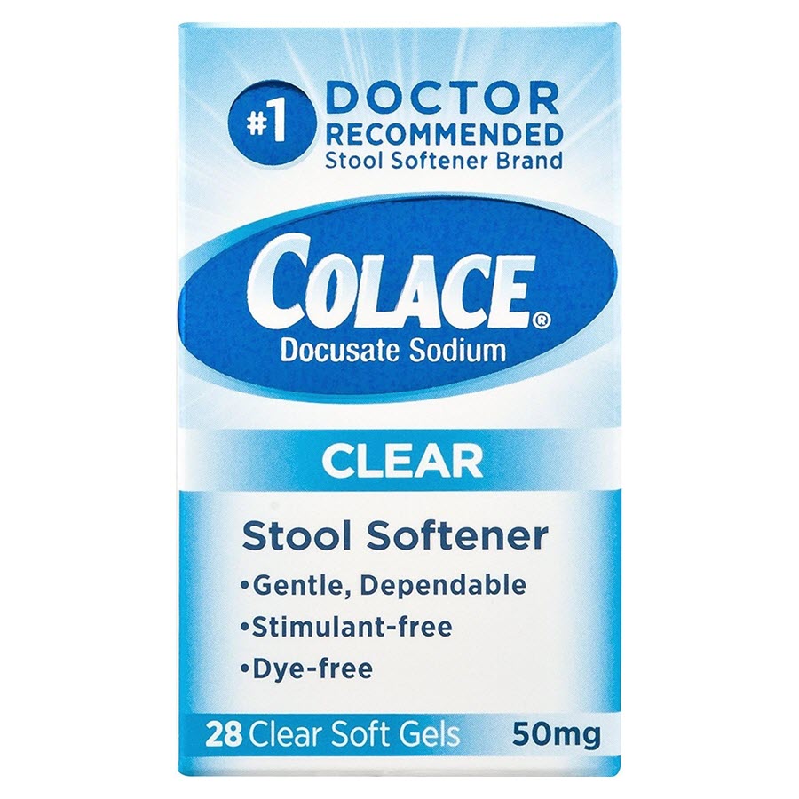 Colace Clear Dye-Free Stool Softener soft gels gently soften hard and painful stool for a number #2 that’s easy to do. Colace is the #1 doctor recommended stool softener brand. Colace docusate sodium stool softener has been trusted by doctors and patients for over 65 years for occasional constipation relief. Colace Clear Dye-Free Stool Softener gently softens stools to relieve many symptoms of occasional constipation, including straining during bowel movements, hard, dry stools, and infrequent or irregular bowel movements. Colace Clear Dye-Free Stool Softener is not a stimulant laxative. Its active ingredient, docusate sodium, allows water and fats to get into the stool, helping to soften and make passing it more comfortable.