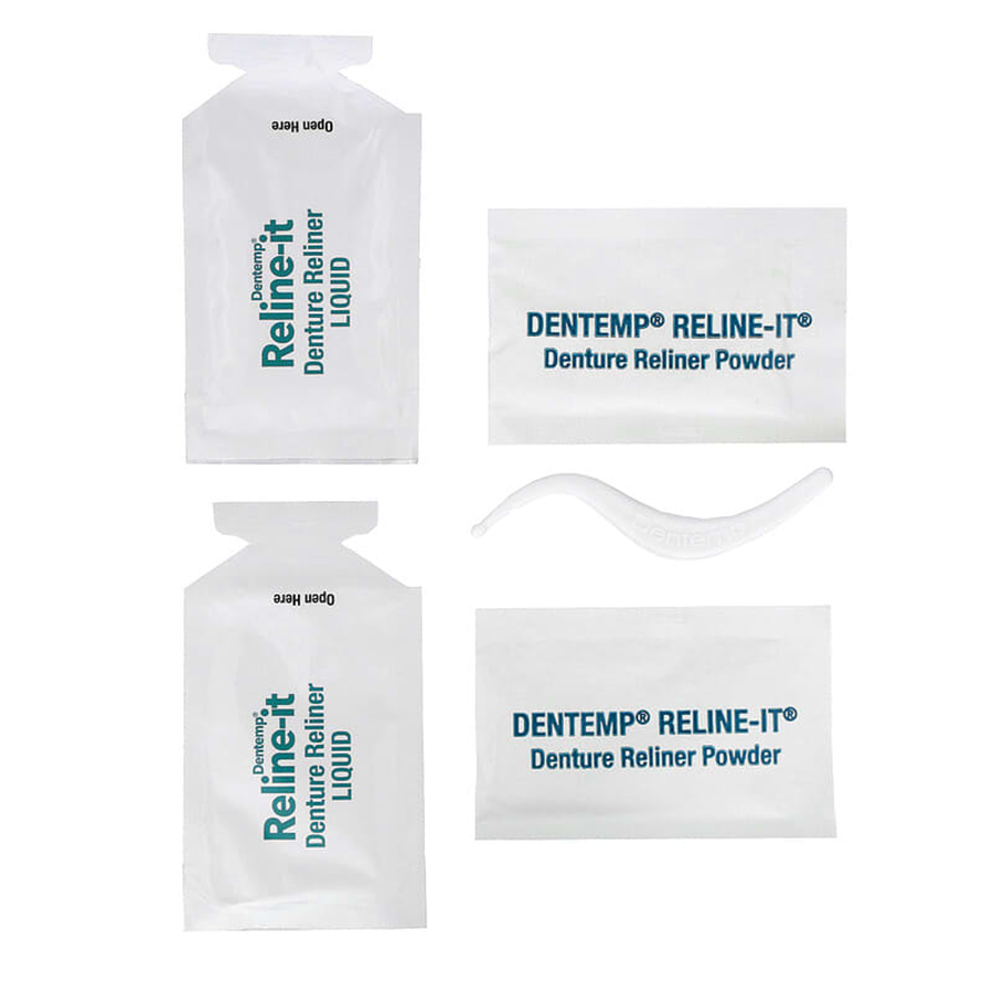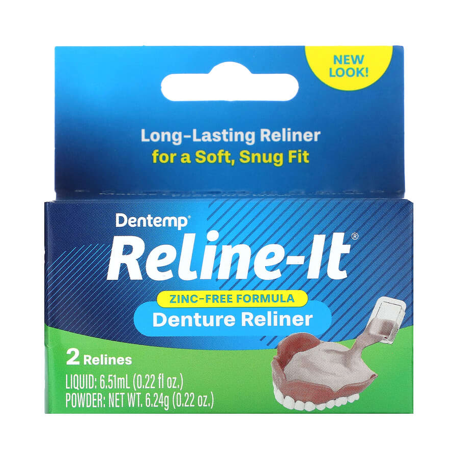 Make loose fitting dentures feel like new. Dentemp reline it denture reliner makes dentures fit like new, is easy to use, and available now. Everyone deserves sound, well fitting dentures. Over time, your dentures will feel looser. Reline it gives you the stability not offered by thick layers of denture adhesive, clean and dry denture thoroughly. Place one packet of powder and one packet of liquid into a freezer for 3 minutes. Mix reline it liquid and powder in one of the enclosed mixing cups, for best results, use up to one week per application. Improper or long term use of denture cushions, pads or reliners may lead to faster gum erosion, irritation and sores, for use only until a dentist can be seen.