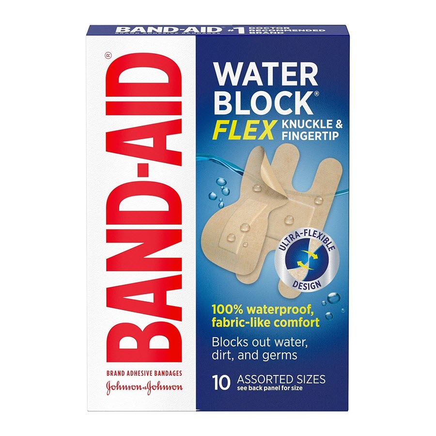 10-count box of 100% waterproof Band-Aid Brand Water Block Flex Adhesive Bandages in assorted sizes for knuckles and fingertips to cover minor cuts, scrapes & wounds while blocking out water, dirt, and germs that may cause infection