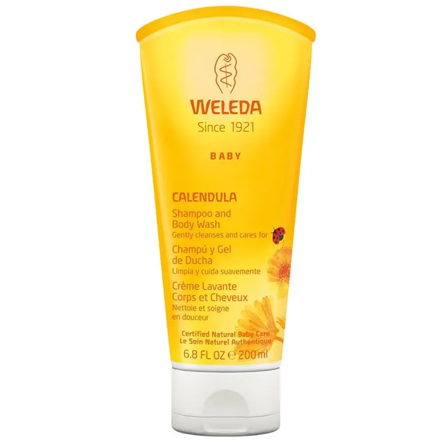 Formulated with the mildest organic and natural plant-based cleansers, Weleda Calendula Shampoo and Body Wash is a gentle wash that retains the moisture in your baby's hair and skin, leaving it feeling silky smooth and protected from drying out. Organic calendula flower extract soothes and softens your baby's hair and skin, while organic sesame seed oil absorbs fast and easily to keep your baby's skin and hair from losing precious moisture. The soft lather doesn't sting baby's eyes. No tears, no tugs, no roughness — just a clean, sweet-smelling, happy baby.