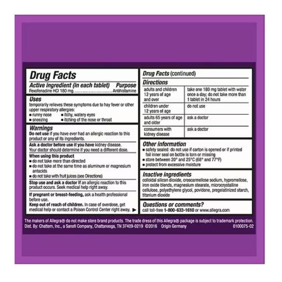 INCLUDES: One (1) 30-count bottle of Allegra Adult Non-Drowsy Antihistamine Tablets for 24-Hour Allergy Relief