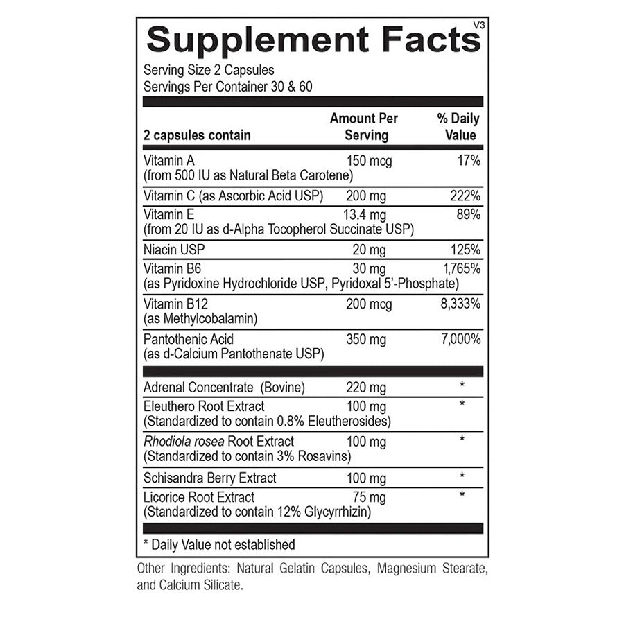 Adren-All® contains a blend of key micronutrients, adaptogenic botanicals and adrenal concentrate specifically formulated to strengthen the body’s stress response and support healthy energy levels. Adren-All® provides targeted amounts of vitamin A and C, pantothenic acid, and other B vitamins that are critical to adrenal gland function. This powerful formulation helps support the body’s resistance to fatigue and aids in maintaining balanced cortisol and DHEA levels.