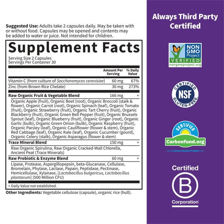 Vitamin Code Raw Zinc supports immune system health, skin and eye health, prostate health and has live probiotics and enzymes to support healthy digestion. Specifically formulated to provide 30mg of high-potency zinc (273% of the Daily Value) plus 60mg of vitamin C, Vitamin Code Raw Zinc is made with 23 powdered organically grown fruits and vegetables, plus alkalizing trace minerals. Raw means no high heat, synthetic binders or fillers, artificial flavors, sweeteners, or additives commonly used in tablets.