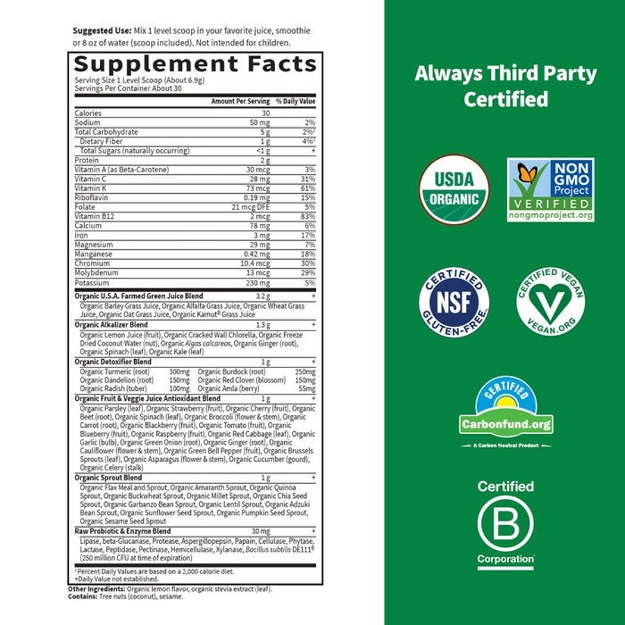 Raw Organic Perfect Food® Alkalizer & Detoxifier is packed with 54 nutrient-dense ingredients, including powerful organic cleansing herbs and balancing alkalizers, plus live probiotics & enzymes.