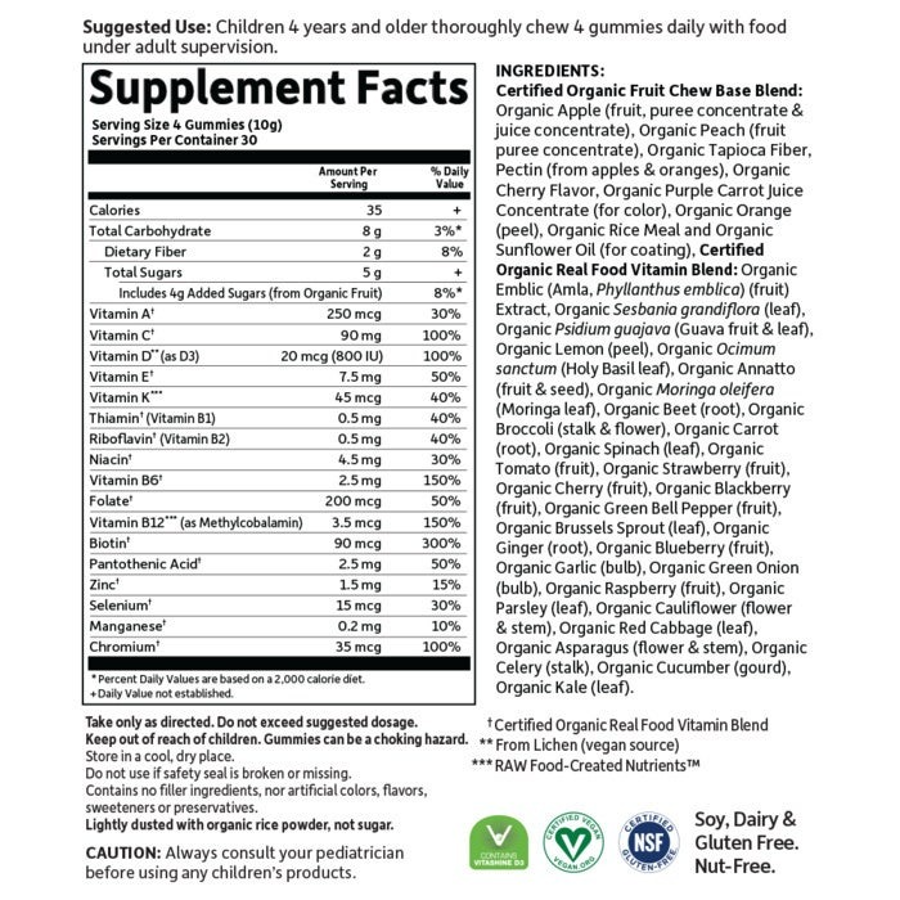 Only the best for your kids, mykind Organics Kids Multi Gummies are Certified USDA Organic and Non-GMO Project Verified fruit and vitamin gummies. Made with nine organic whole fruits in every bottle—no synthetic vitamins. Each chew is made with pectin from non-GMO apples and organic orange peel—no pig gelatin.