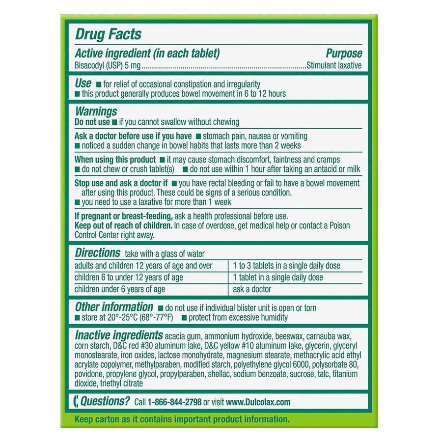 Dulcolax 5 mg comfort coated laxative tablets to relieve constipation relieves occasional constipation and irregularity. This product usually causes bowel movement in 6 to 12 hours. Trusted for guaranteed relief. Overnight relief.
