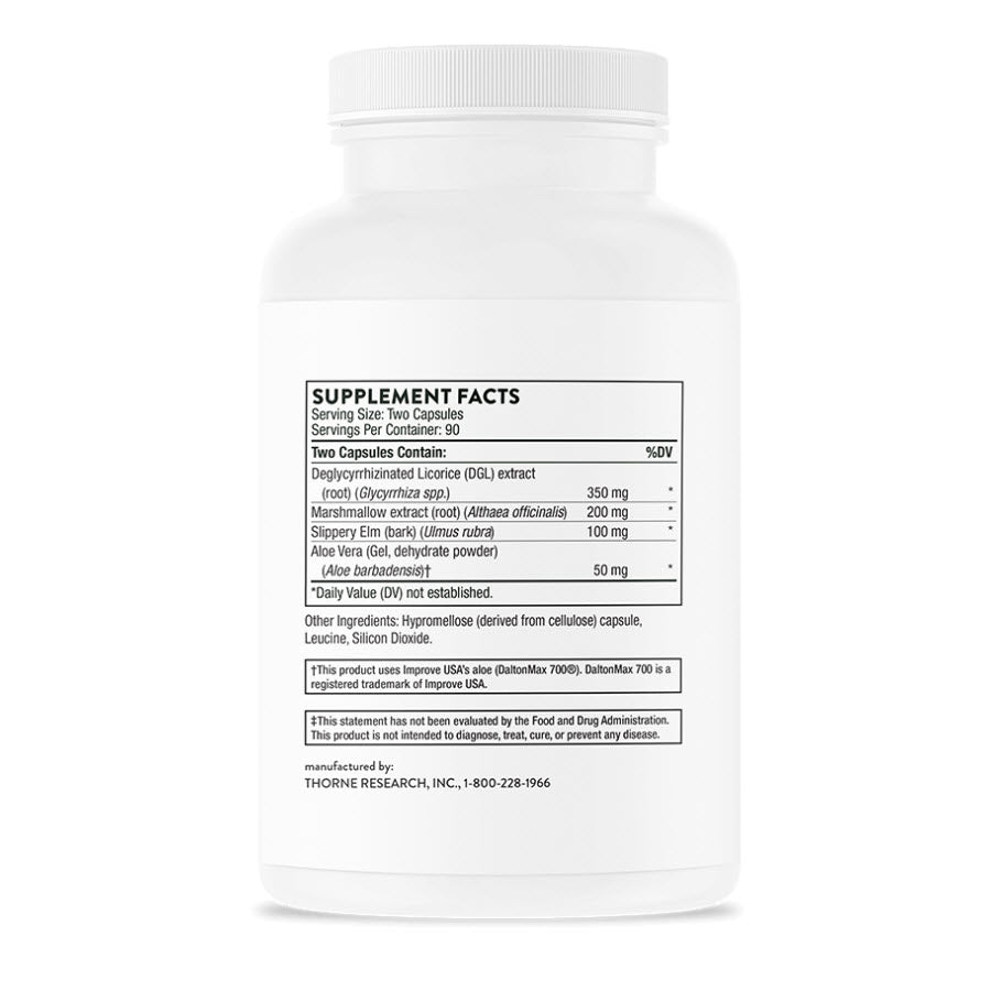 Overindulgence of food and drink – especially spicy foods – can lead to the discomfort of GI irritation. Thorne’s GI Relief comes to the rescue with a blend of soothing botanicals to help relieve gastrointestinal discomfort. Aloe vera gel, deglycyrrhizinated licorice (DGL), slippery elm bark, and marshmallow root help calm irritated tissues and support the mucous membranes of the GI tract.