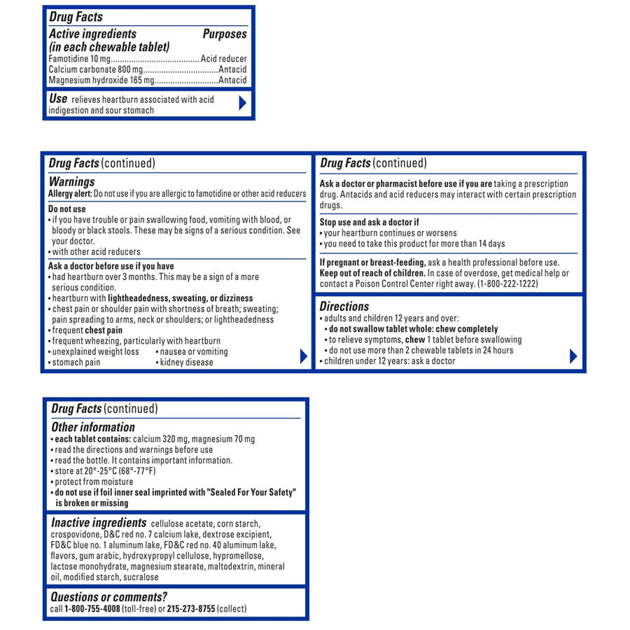 ● Formulated with 10 mg of the acid reducer famotidine, 800 mg of the antacid calcium carbonate and 165 mg of the antacid magnesium hydroxide per tablet, this heartburn reliever helps to neutralize and control acid.