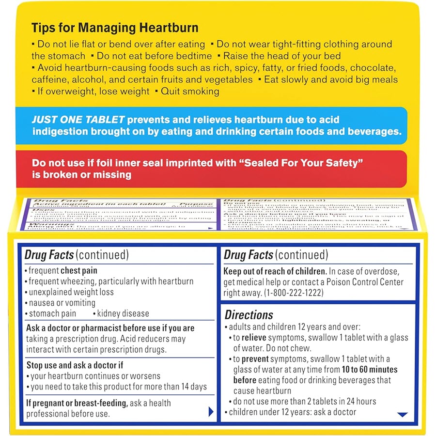 Each tablet contains 20 mg of famotidine, a known acid reducer, for heartburn relief & acid control. Acid reducing tablets can prevent heartburn if taken 10-60 minutes before consuming food or beverage