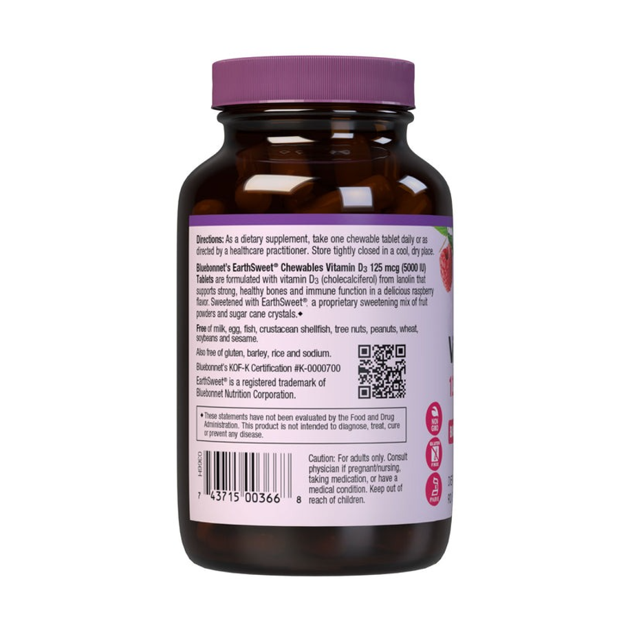 Bluebonnet's EarthSweet® Chewables Vitamin D3 5000 IU (125 mcg) Tablets contain vitamin D3 (cholecalciferol) from lanolin that supports strong healthy bones and immune function in a delicious raspberry flavor. This product is sweetened with EarthSweet®, a proprietary sweetening mix of juice concentrates (wild blueberry, cranberry, prune cherry, strawberry, raspberry and bilberry fruits, grape seed and raspberry seed extracts) and cane crystals. Available in chewable tablets for maximum assimilation and absorption.