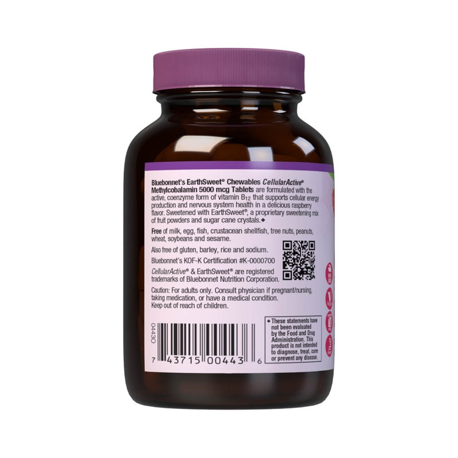 Bluebonnet's EarthSweet® Chewables CellularActive® Methylcobalamin 5000 mcg Tablets are formulated with the active, coenzyme form of vitamin B12 that supports cellular energy production and nervous system health in a delicious raspberry flavor. Sweetened with EarthSweet®, a proprietary sweetening mix of fruit powders and sugar cane crystals.