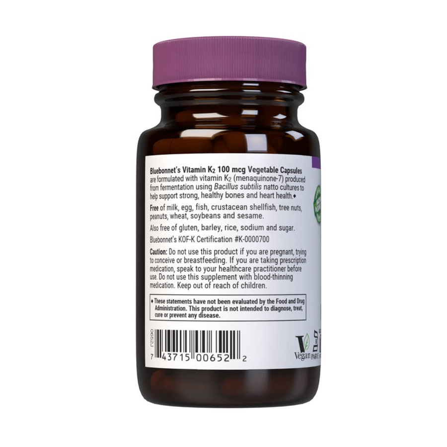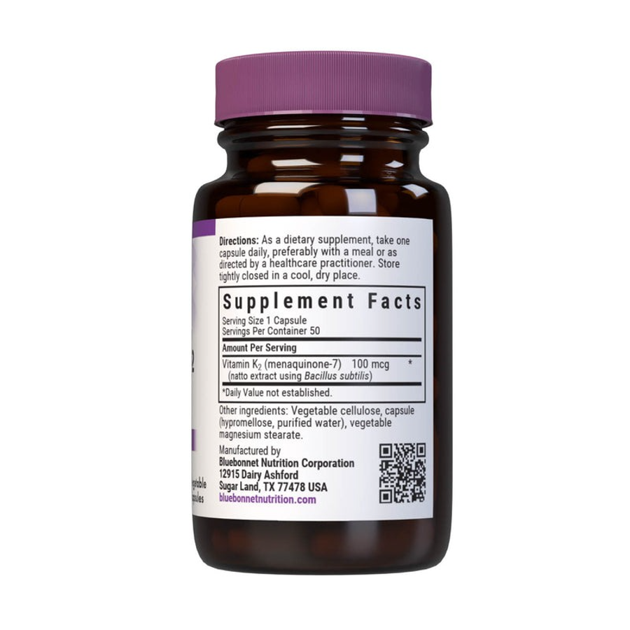 Bluebonnet's Natural Vitamin K2 100 mcg Capsules contains Menaquinone-7 (MK-7) which is produced through a patented biofermentation process from Bacillus subtilis natto cultures. Menaquinone-7 is an enhanced bioactive form of vitamin K2. Available in easy-to-swallow vegetable capsules for maximum assimilation and absorption.
