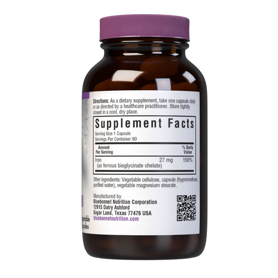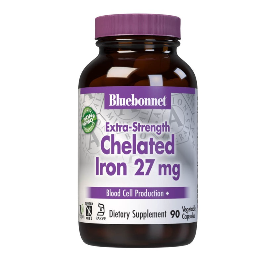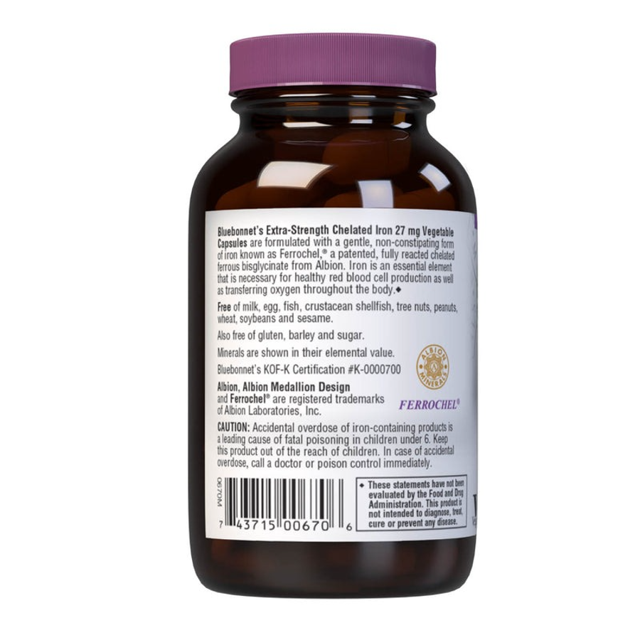 Bluebonnet's Extra-Strength Chelated Iron 27 mg Vegetable Capsules are formulated with a gentle, non-constipating form of iron known as Ferrochel®, a patented, fully reacted chelated ferrous bisglycinate from Albion. Iron is an essential element that is necessary for healthy red blood cell production as well as transferring oxygen throughout the body.