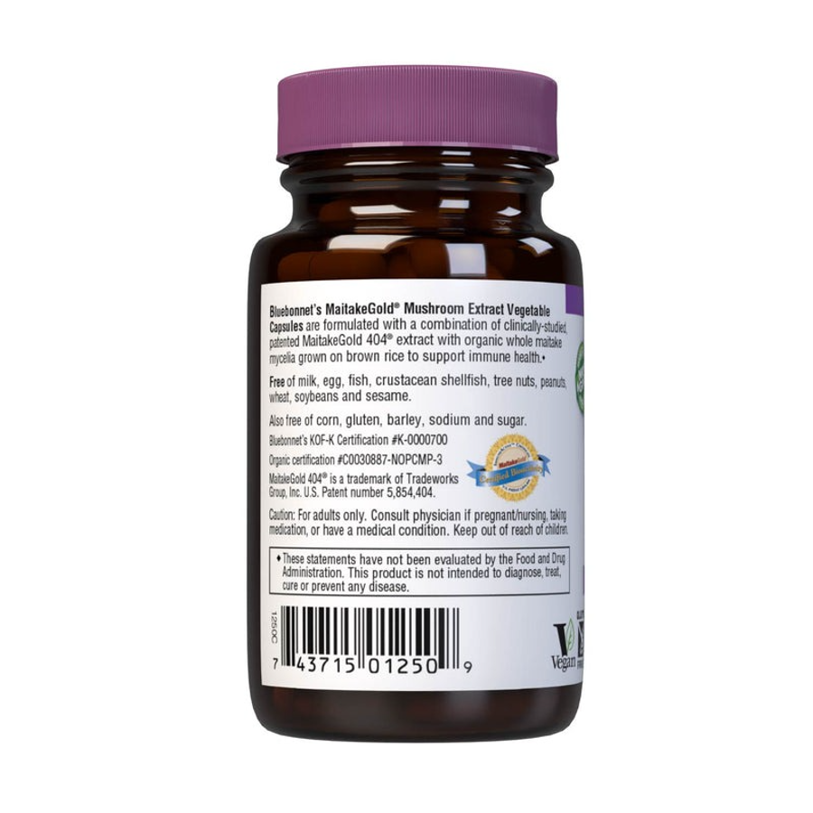 Bluebonnet's Maitake Mushroom Extract Vcaps have been expertly formulated to combine the clinically studied, patented MaitakeGold 404 extract with the full spectrum benefits of kosher-certified, organic whole maitake mycelia grown on purple corn that is a rich source of olyphenols, specifically anthocyanins. Available in easy-to-swallow vegetable capsules for maximum assimilation and absorption.