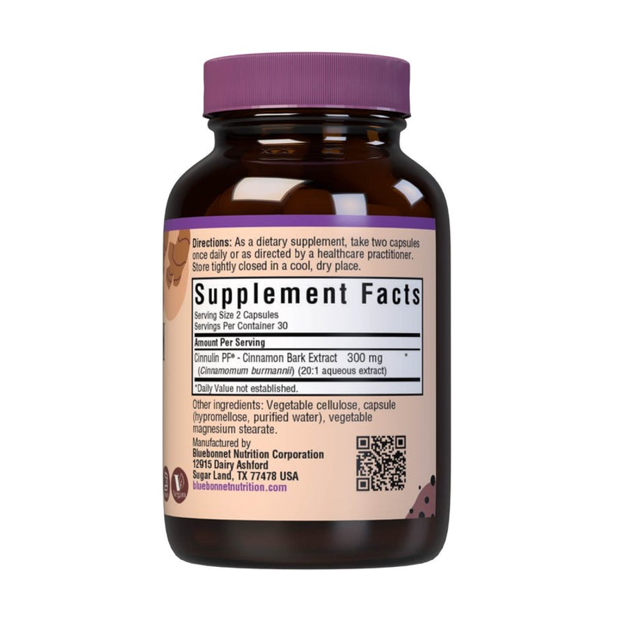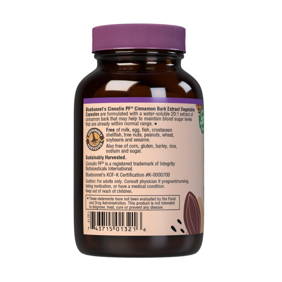 Bluebonnets Cinnulin PF Cinnamon Bark Extract Capsules contain a water-soluble extract that is carefully produced by a clean and gentle water-based extraction method is employed to capture and preserve cinnamons most valuable components while eliminating toxic compounds typically found in whole cinnamon and fat-soluble cinnamon extracts. Available in easy-to-swallow vegetable derived capsules for maximum assimilation/absorption and for a truly vegetarian/vegan formula.
