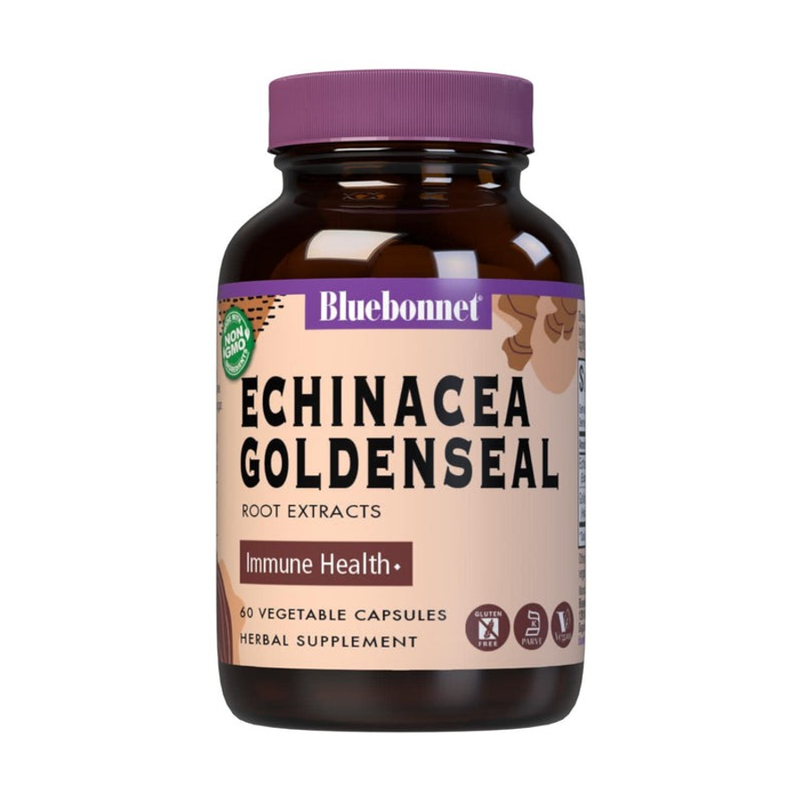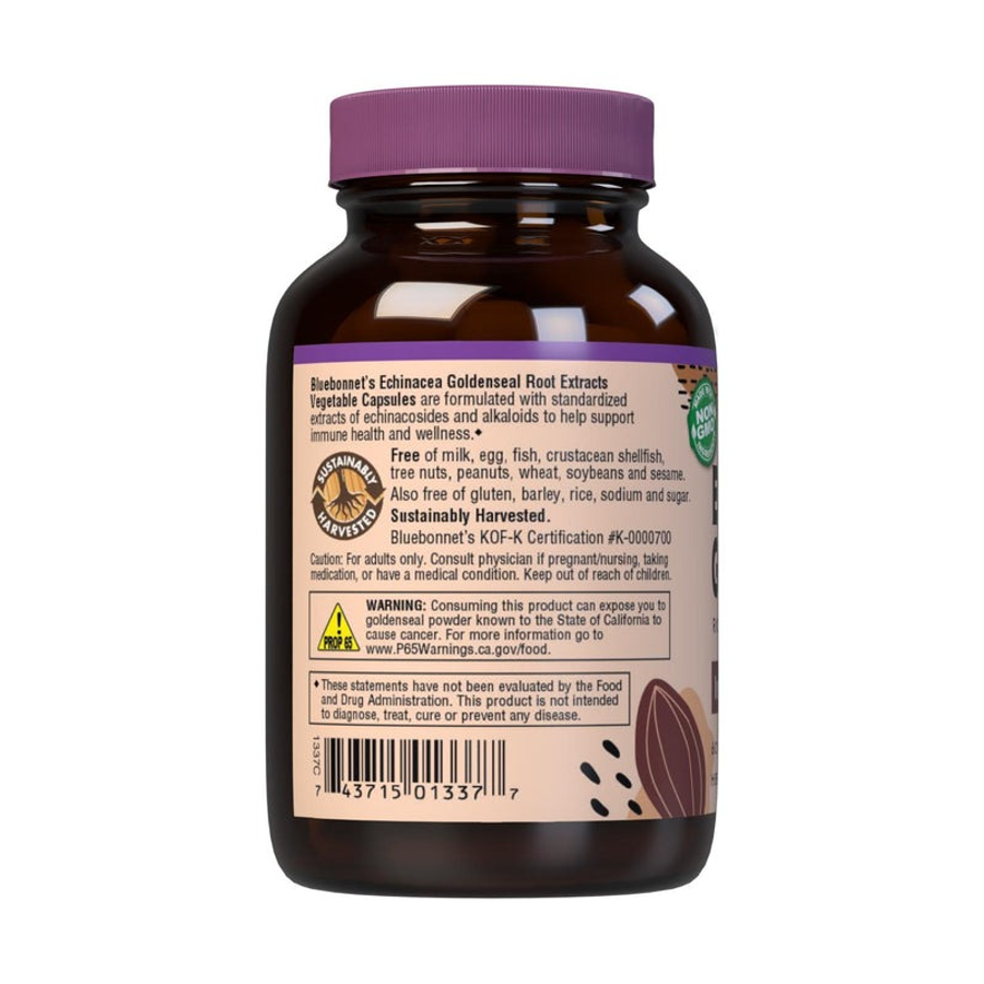 Bluebonnets Standardized Echinacea Goldenseal Root Extract Capsules provide a standardized extract of echinacosides and alkaloids, the most researched active constituents found in echinacea and goldenseal, respectively. A clean and gentle water-based extraction method is employed to capture and preserve both echinacea and goldenseals most valuable components. Available in easy-to-swallow vegetable derived capsules for maximum assimilation/absorption and for a truly vegetarian/vegan formula.