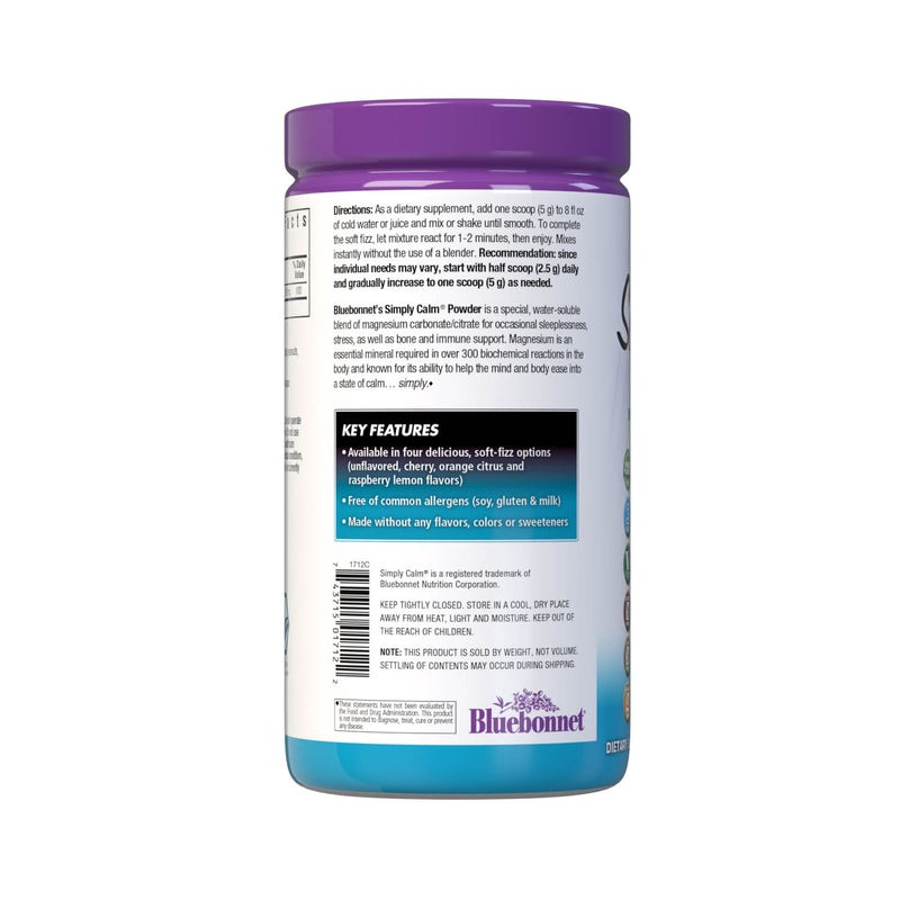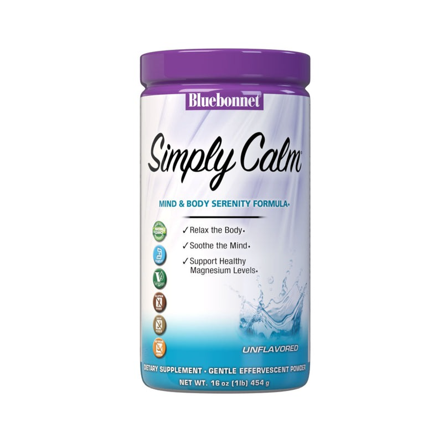 Bluebonnet's Simply Calm™ Powder is a special, water-soluble blend of magnesium carbonate/citrate for occasional sleeplessness, stress, as well as bone and immune support. Magnesium is an essential mineral required in over 300 biochemical reactions in the body and known for its ability to help the mind and body ease into a state of calm...simply.