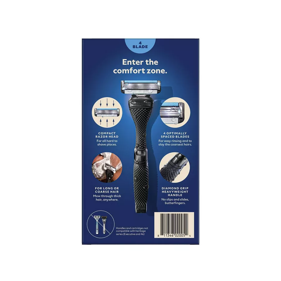 Four precision cut, stainless-steel razor blades in a compact razor head help you achieve an effortless shave. The handle features a distinctive diamond-patterned grip to help prevent slipping