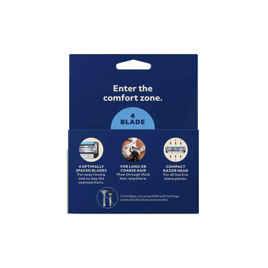 Dollar Shave Club's razors were made with your skin and hair in mind, and as part of our mission to help guys look, feel, and smell their best. The Dollar Shave Club 4 Blade Razor Blade Refill Cartridges 4ct are here to provide the all-terrain shave you've been searching for. Already have a Dollar Shave Club 4 Blade Razor handle? Perfect. Check out this pack of four refill cartridges to keep the great shaves rolling. Each of the four blades are precisely spaced, wide enough to allow thick and long hair to pass through with ease, as well as helping to prevent annoying pulling and tugging. This razor can tackle the wildest of hair forests whether they grow on the face, armpits or legs, making it the perfect razor for the all-terrain shaver no matter the body parts you're shaving. Prickly faces and untamed armpits agree, this razor's the real deal. So if you've got hair, the 4 Blade All-Terrain Razor's got you.