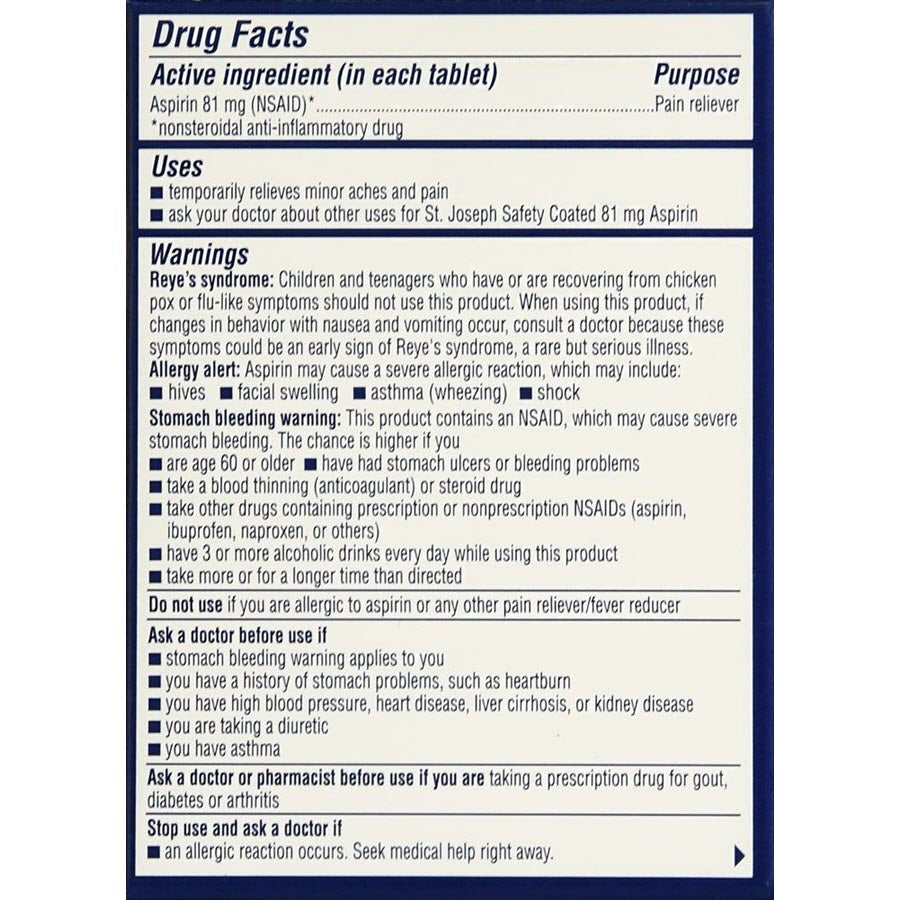 St.Joseph aspirin 81mg enteric coated pain reliever tabletsEach one of the original chewable tablets contains 81 mg of aspirin, the dose most doctors recommend for daily aspirin regimens. Many of the baby boomer customers remember the chewable tablets as being easy to swallow with a pleasant taste. The chewable tablets are also recommended for those who have difficulty swallowing pills. Remember an aspirin regimen is not right for everyone, talk to doctor before beginning or revising aspirin regimen.